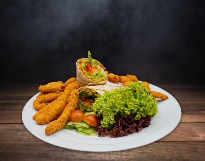 gefüllt mit Eisbergsalat, Tomatensauce, Gurken, Paprika, Karotten dazu Chicken Strips