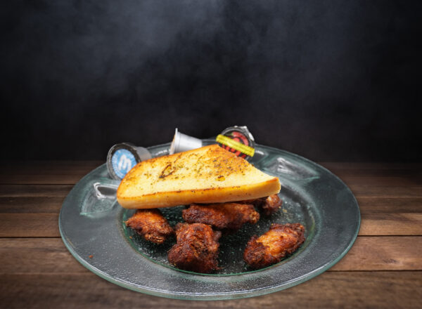 marinierte Hühnerflügel mit verschiedenen Dips und Knoblauchbrot
