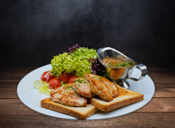 gegrilltes Schweinerückensteak auf Toast mit Champignonrahmsauce, Kräuterbutter und Salatgarnitur