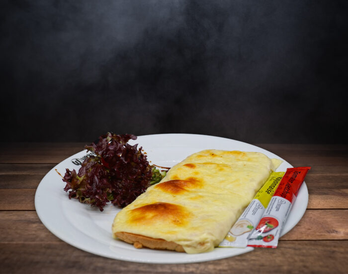 gebackenes Hühnerfilet, Sauerrahm, Paprika, Tomaten, Gurken, Zitrone, Cocktailsauce und Salat