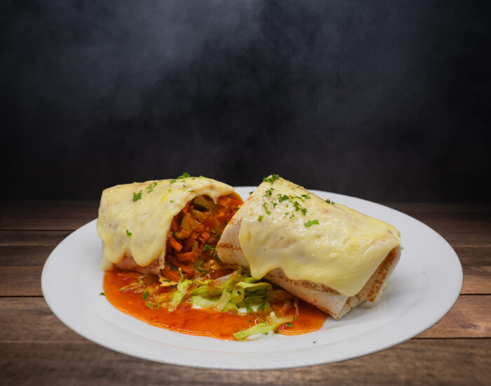 gefüllt mit Mais, Bohnen, frischem Gemüse und gebratenen Rindfleischstreifen