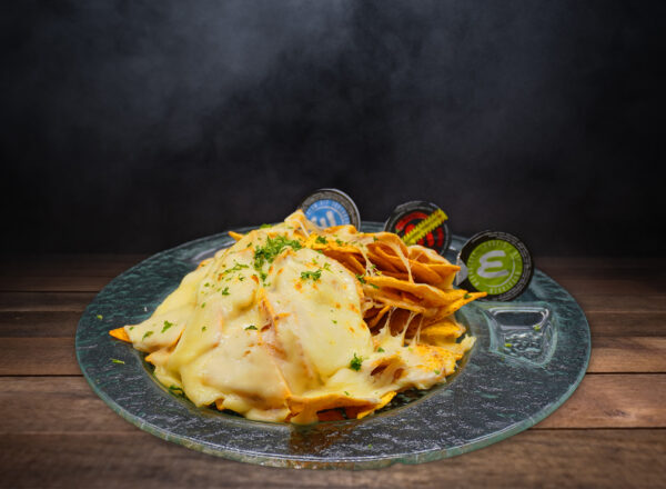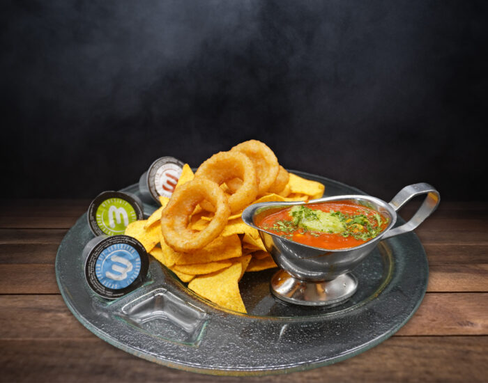 mit Salsa-Dip, Bohnen, Mais, Tomaten, Zwiebeln und Limetten