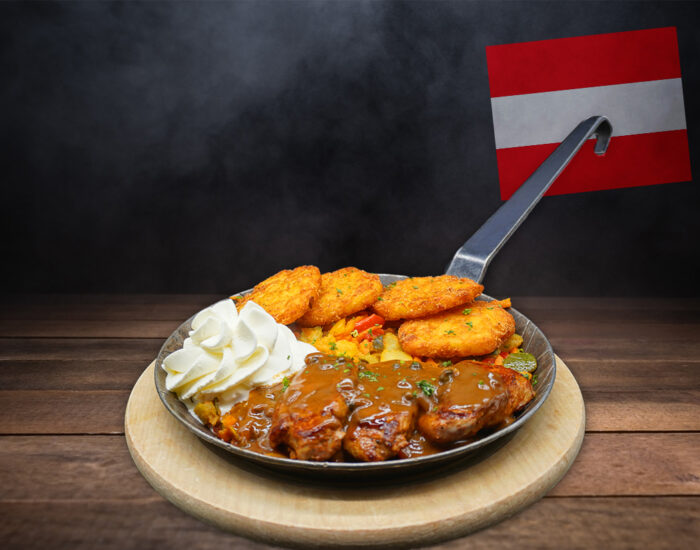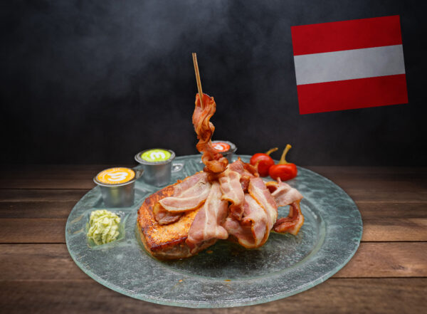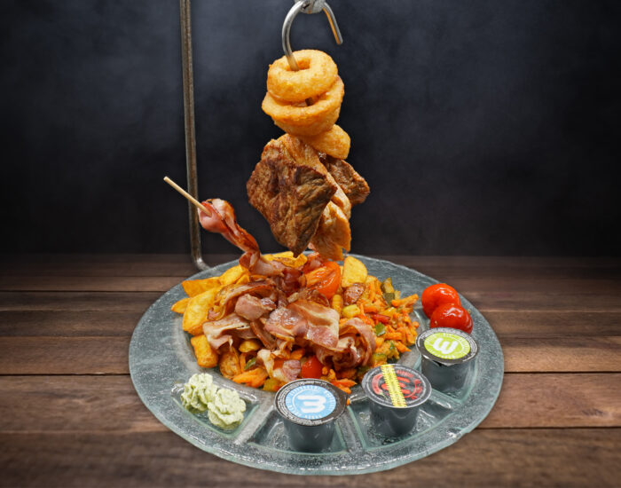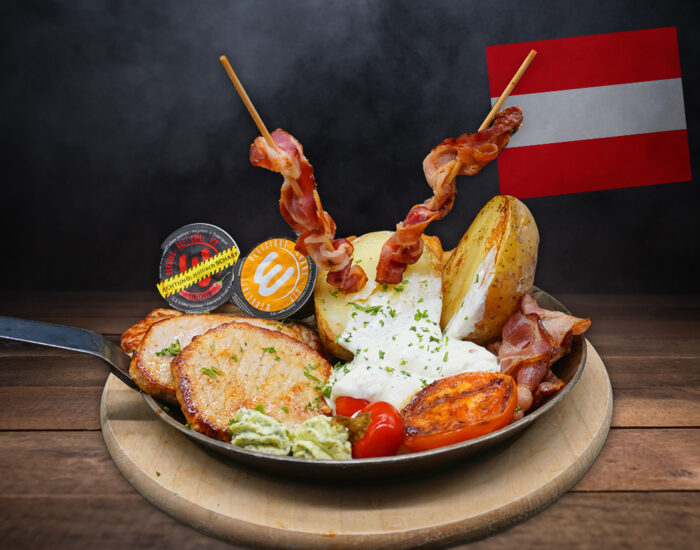 Wiener Schnitzel vom Schwein, gegrillte Medaillons vom Rind & Huhn dazu Pommes frites, gebackene Zwiebelringe, Speck, Kräuterbutter und verschiedene Dips