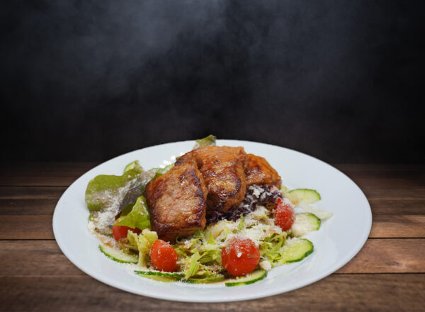 gegrillte Rindermedaillons auf gemischten Blattsalaten mit italienischem Dressing und frischem Parmesan