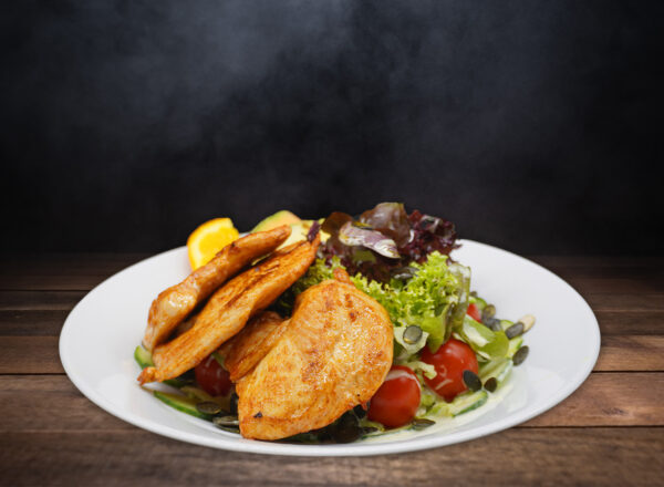 gegrilltes Hühnerbrüstchen auf knackigen Blattsalaten mit Joghurtdressing und Kernöl