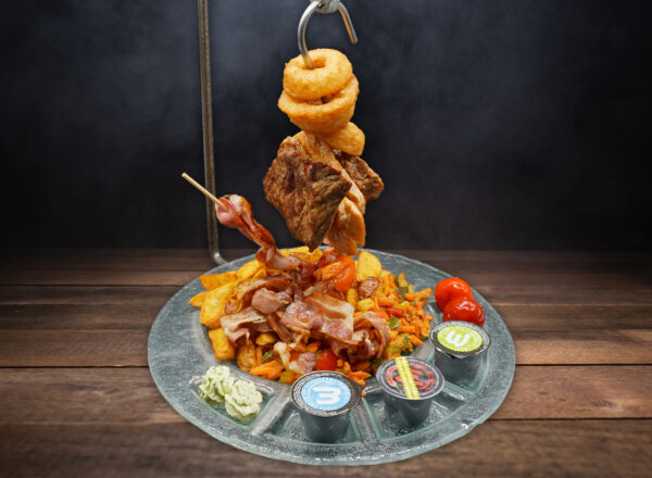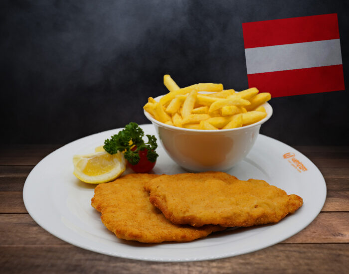 Wiener Schnitzel vom Schwein, gegrillte Medaillons vom Rind & Huhn dazu Pommes frites, gebackene Zwiebelringe, Speck, Kräuterbutter und verschiedene Dips