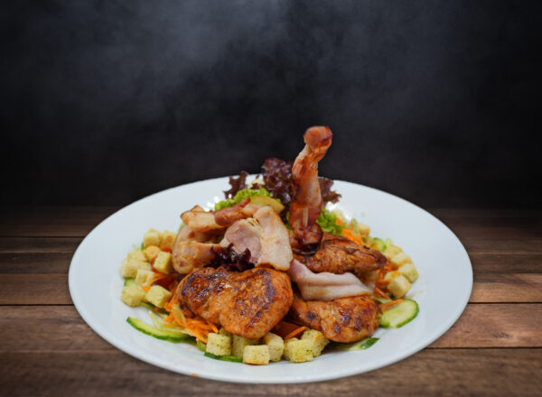 Blattsalate an italienischem Dressing mit zart-rosa gegrillten Schweinelendchen und kross gebratenem Speck