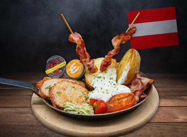 vier Scheiben Schweinerücken mit gebratenen Speck, Zwiebelringe, Grilltomate, Ofenkartoffel, dazu Dips