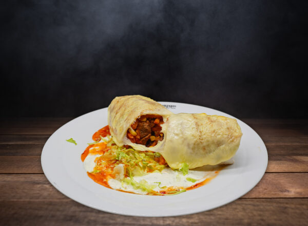 gefüllt mit Mais, Bohnen, frischem Gemüse und gebratenen Rindfleischstreifen