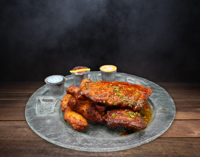saftige Ribs und 6 Stück feurig scharfe Buffalo Wings, dazu drei verschiedene Dip Saucen