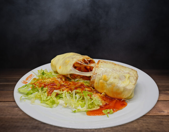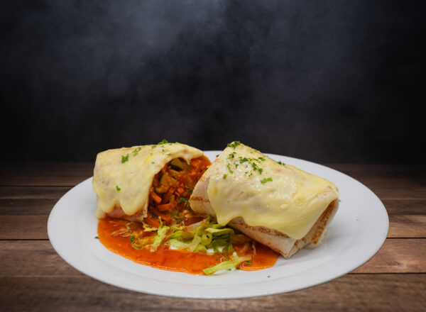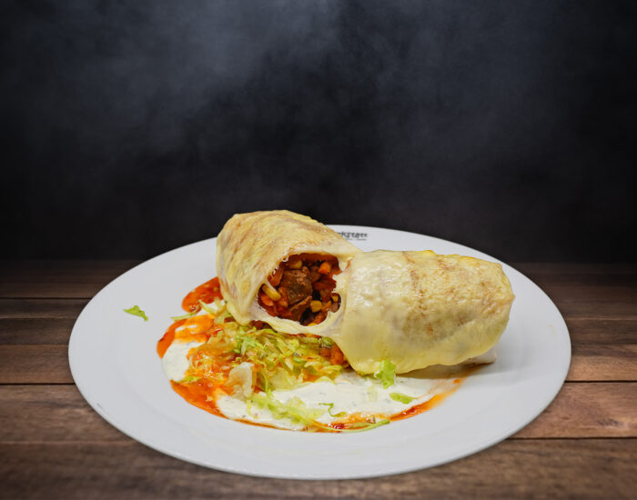 gefüllt mit Mais, Bohnen, frischem Gemüse und gebratenen Rindfleischstreifen